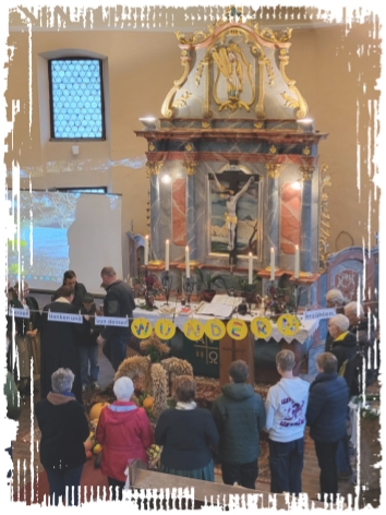 Festlich geschmückte Erntekronen und liebevoll präsentierte Gaben von Feld, aus Garten und von den Obstbäumen und -sträuchern erinnerten sichtbar an die Fülle, die uns geschenkt ist.