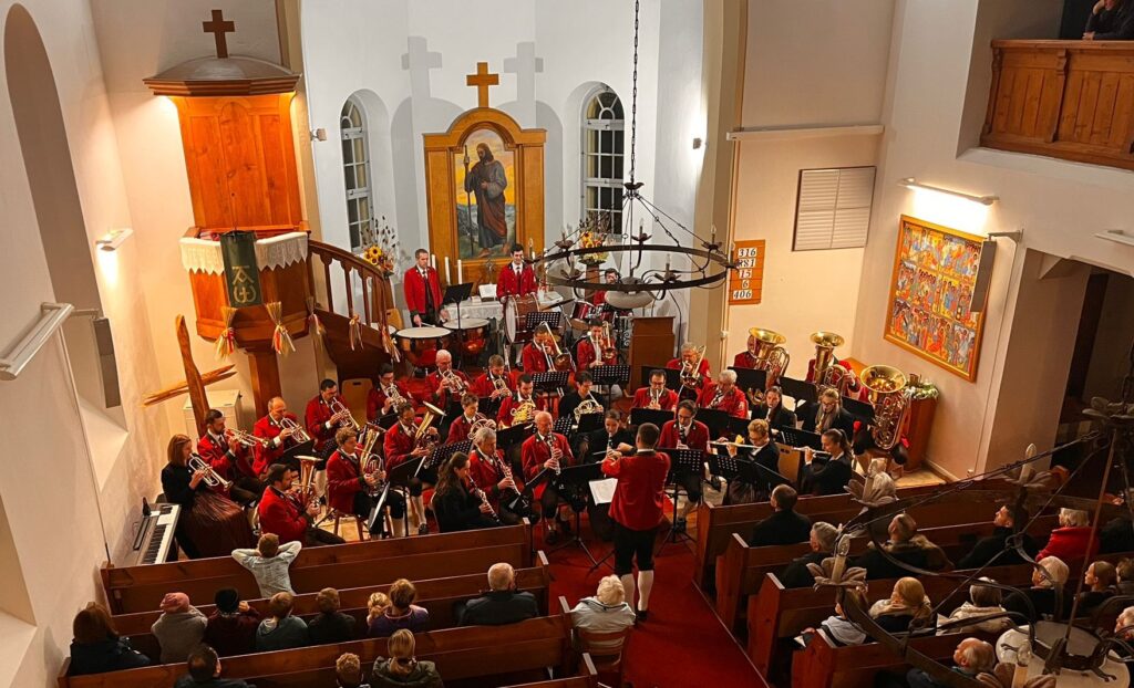 Die Schneerosenkirche, die bald ihr 100-jähriges Bestehen feiern darf, erstrahlte an diesem Abend in ihrer einfachen Schönheit. Sanftes Licht, schlichte Eleganz und eine Atmosphäre, die jeden Klang tragen konnte, ließen den Raum zu einem Ort voller Stimmung und Tiefe werden. Der Musikverein Almrausch Mitschig[1] füllte ihn mit seiner ganzen Klangfülle – von zarten, leisen Tönen bis hin zu kraftvoller, majestätischer Strahlkraft.